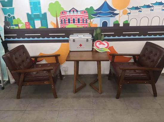 除此之外,为了更好的改善这些一线工人的工作条件,社区在长虹路上设置了长虹路爱心驿站,驿站内设饮水机、凉茶、医药箱、沙发、空调等设施,能够为这些一线工作者提供临时休憩、饮用水、凉茶、手机充电、测量血压、为环卫工人义务剪发等爱心服务。驿站的日常维护工作也由翔鹭社区家庭女性志愿者组织手绘翔妈志愿者服务队自愿承担。