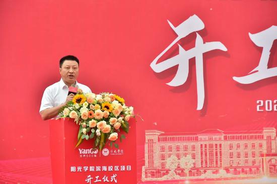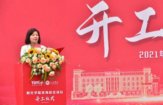 阳光控股有限公司执行总裁林冰代表阳光控股对阳光学院滨海校区项目开工建设表示祝贺,并向关心支持阳光学院的各级领导表示感谢。林冰介绍了阳光学院滨海校区的设计理念以及建筑风格特色。她表示,将以高标准、高要求严把工程质量和安全关,将该项目建成力争建成福州乃至全国高校中又一精品工程、示范工程。
