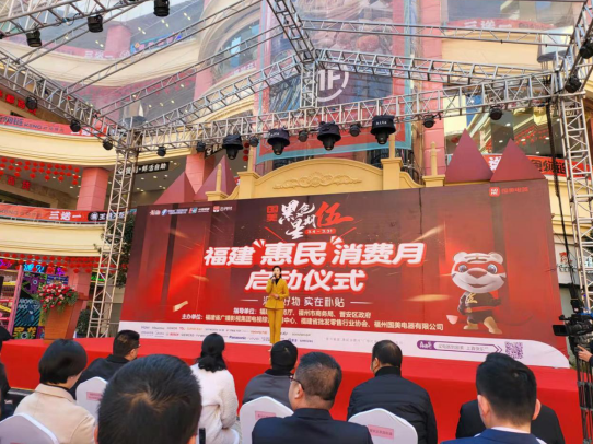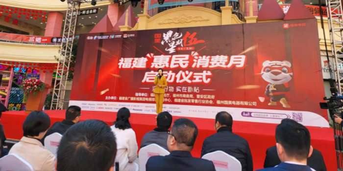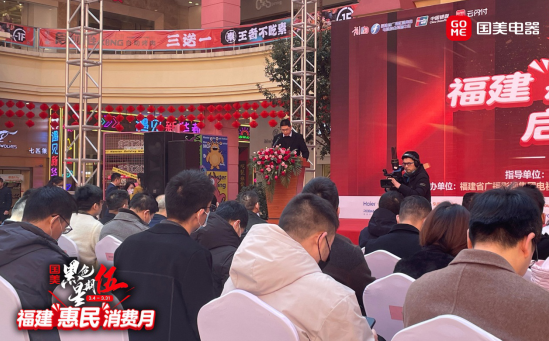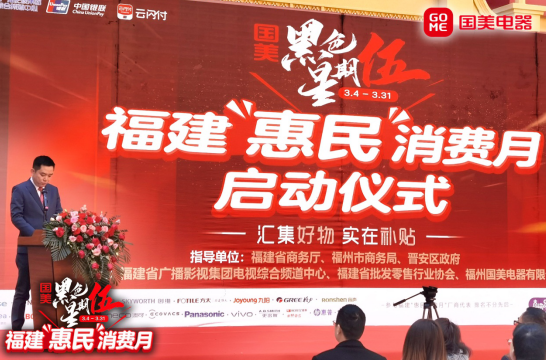 关注由福建省商务厅、福州市商务局、晋安区政府指导,福建省广播影视集团电视综合频道中心、福建省批发零售行业协会联合福州国美电器有限公司共同举办的“福建惠民消费月”暨“黑色星期伍”启动仪式于2月24日上午10点在宝龙广场举行。福建省商务厅、福州市商务局、晋安区商务局等商务主管部门领导,行业协会领导,以及中国银联福建分公司,上海宝龙商业地产管理有限公司福州分公司,红星美凯龙福建省营发中心等相关行业代表,福州国美电器及家电品牌代表、新闻媒体记者共同出席启动仪式。