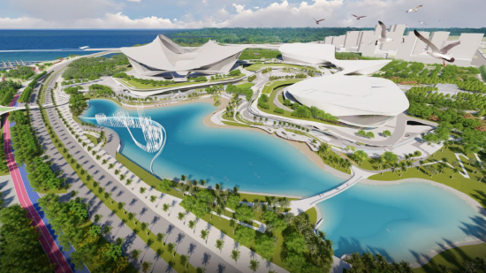 活力内湾临近新体育中心,包含曲韵广场、休闲园路、滨海绿化、瀑布水帘等工程景观。新体育中心举办重要赛事时,可将内湾的水排干,形成一个3万多平方米的应急疏散沙滩广场。