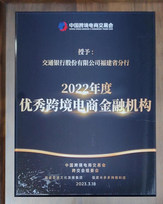 交通银行福建省分行荣获2022年度优秀跨境电商金融机构称号