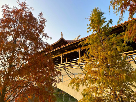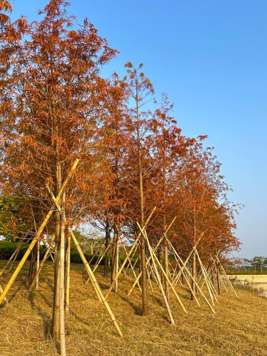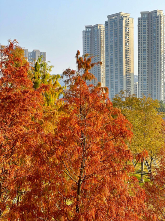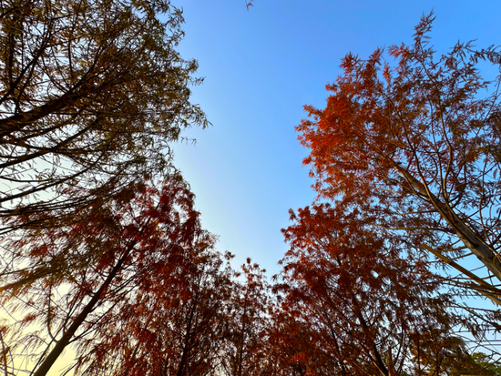 阳光洒在落羽杉上,透过间隙映衬着落羽杉的绯红,为冬日带来一丝暖意。
