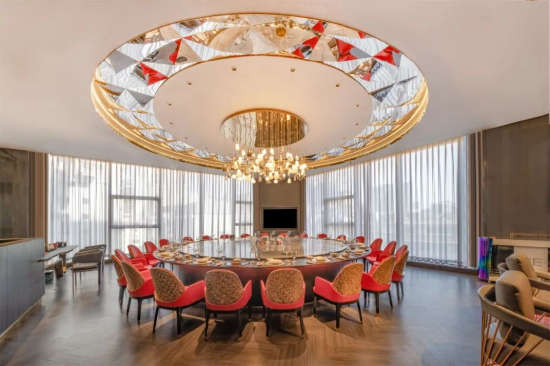 5楼大宴会厅以滩涂涟漪为装饰主题,7米挑高无柱设计,穹顶由2200朵茉莉花瓣艺术组成,搭配美国EV&BOSE高端音响系统、11米宽超高清LED主屏及专业舞美灯光,足以承载各类宴席、庆典与活动。