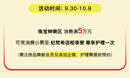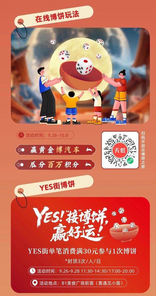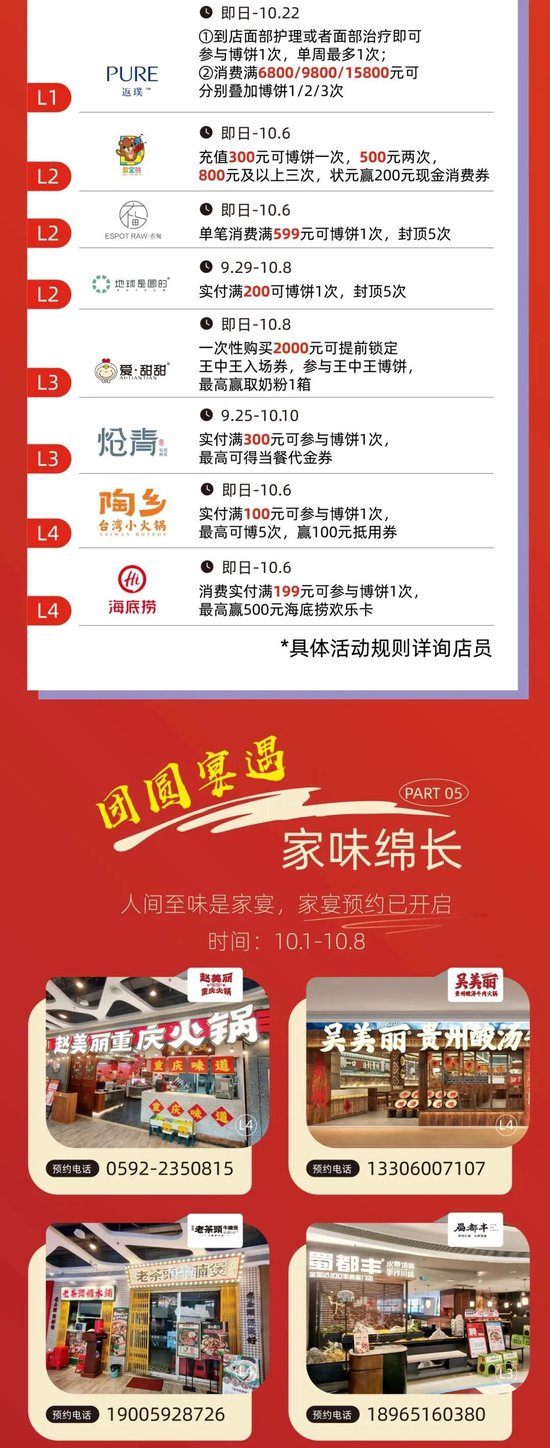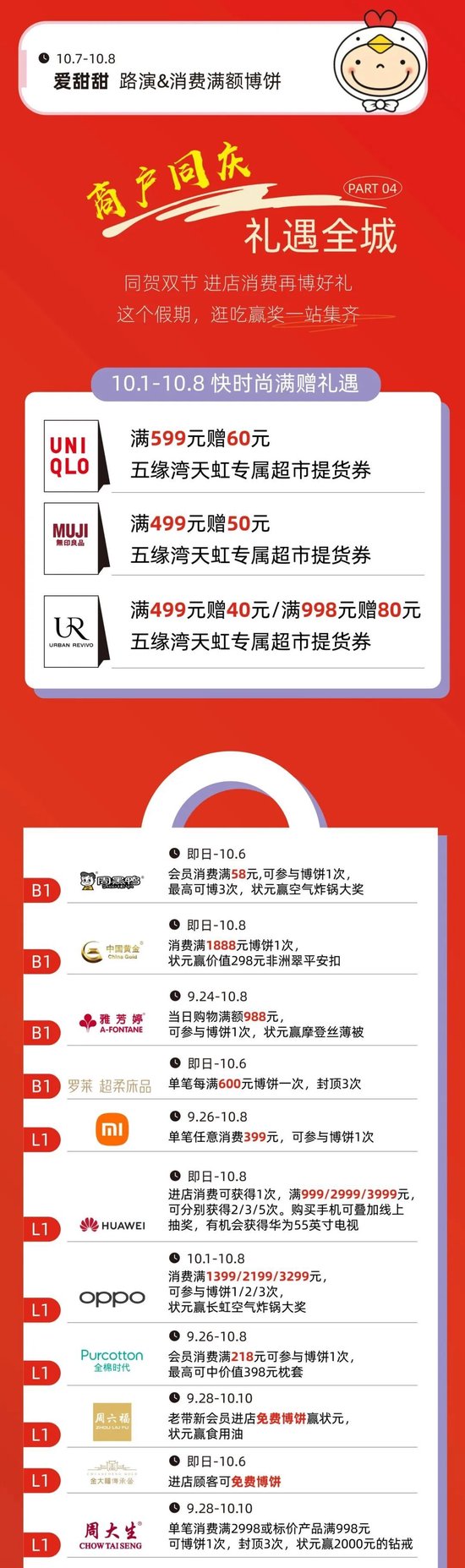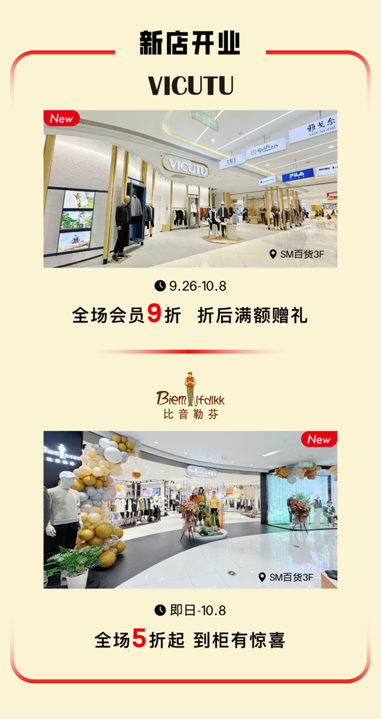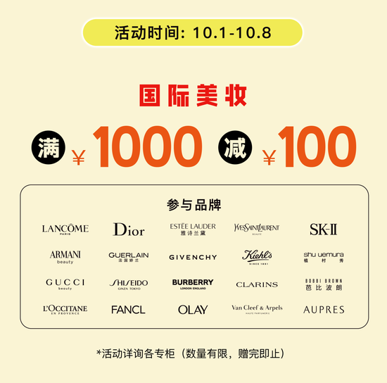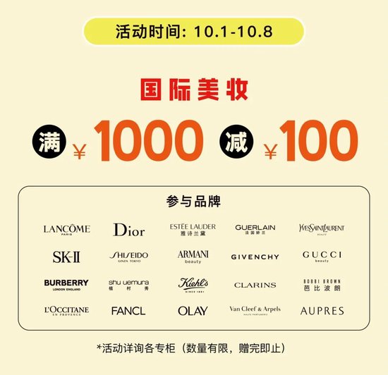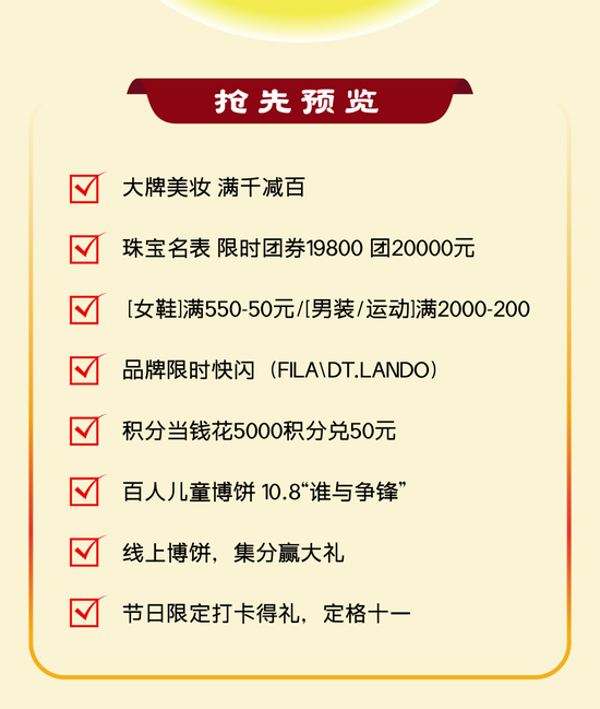 10月1日- 10月8日,国际化妆品满千减百,娇韵诗会员节超值礼盒满赠;珠宝馆黄金最高克减100元,叠加团券享折上折。鞋服秋装 6折起,女鞋、男装等折后满减。9月25日 - 10月8日线上博饼赢千元卡,10月8日线下儿童博饼赢600元购物卡。