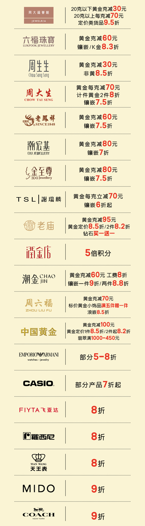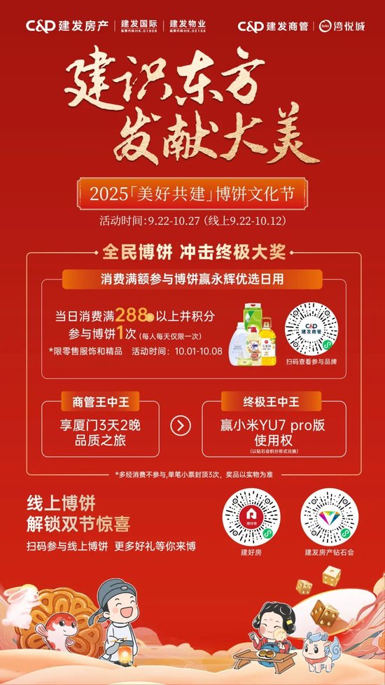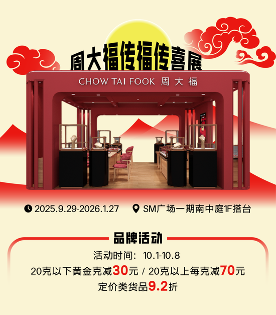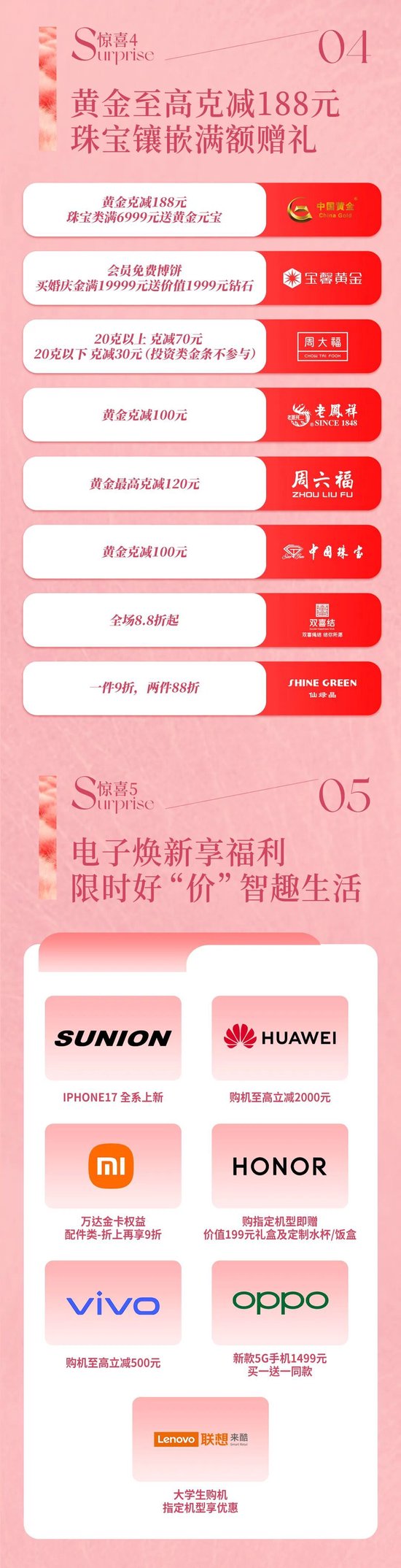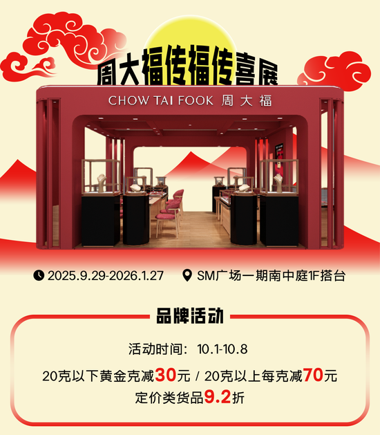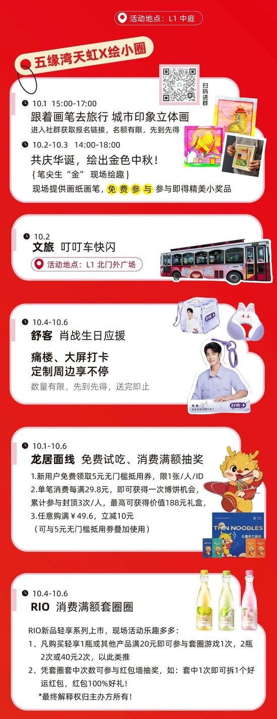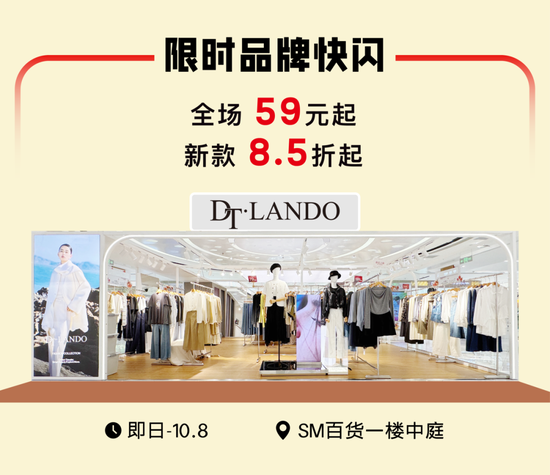 10月1日- 10月8日,国际化妆品满千减百,娇韵诗会员节超值礼盒满赠;珠宝馆黄金最高克减100元,叠加团券享折上折。鞋服秋装 6折起,女鞋、男装等折后满减。9月25日 - 10月8日线上博饼赢千元卡,10月8日线下儿童博饼赢600元购物卡。