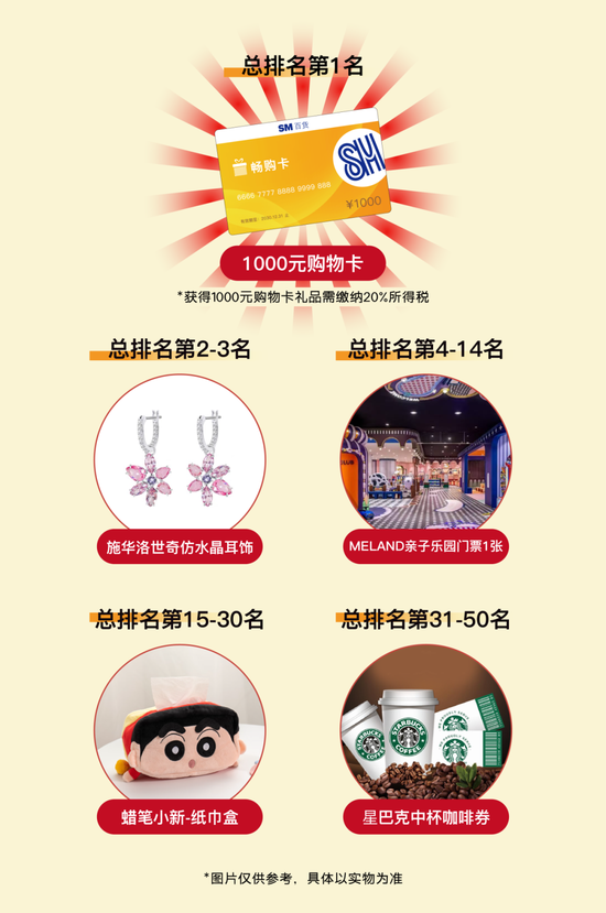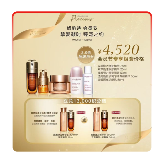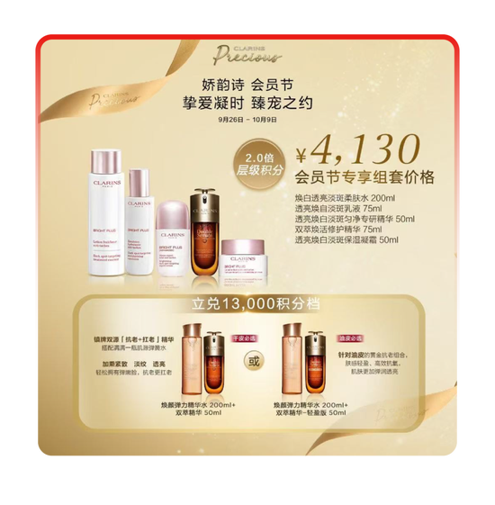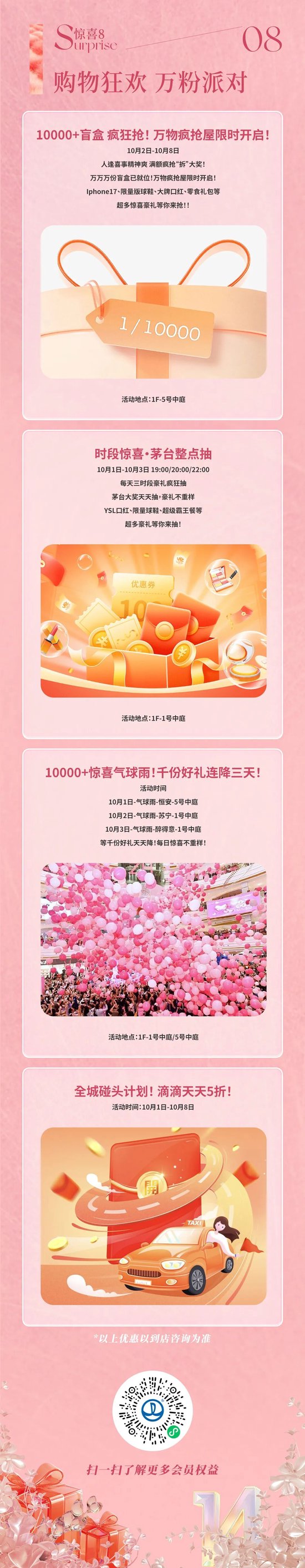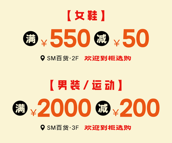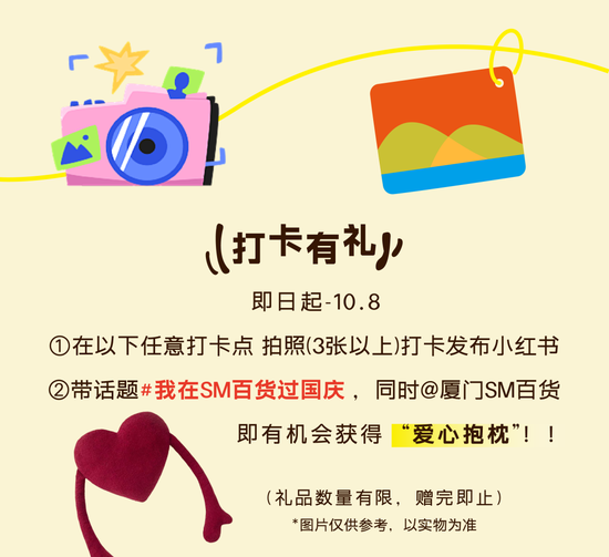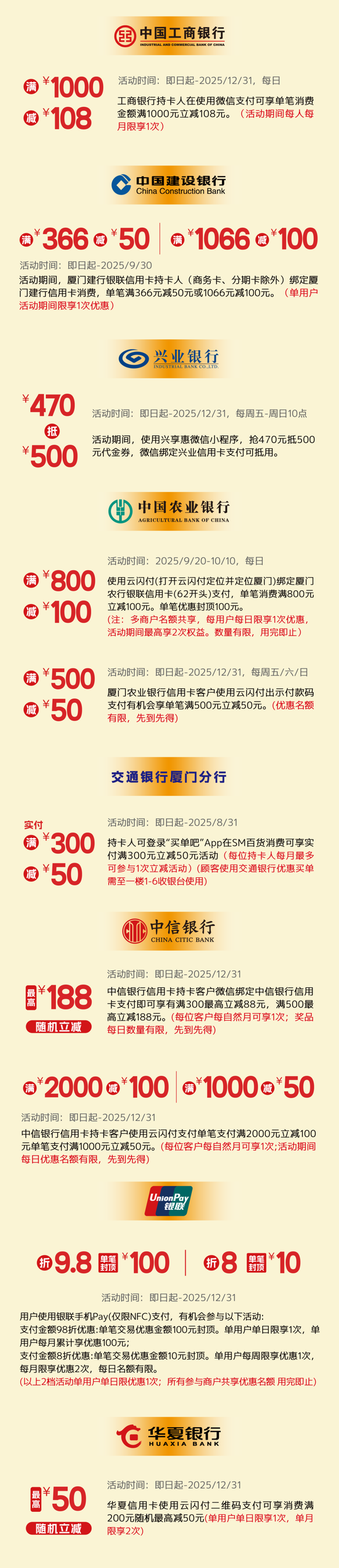 10月1日- 10月8日,国际化妆品满千减百,娇韵诗会员节超值礼盒满赠;珠宝馆黄金最高克减100元,叠加团券享折上折。鞋服秋装 6折起,女鞋、男装等折后满减。9月25日 - 10月8日线上博饼赢千元卡,10月8日线下儿童博饼赢600元购物卡。