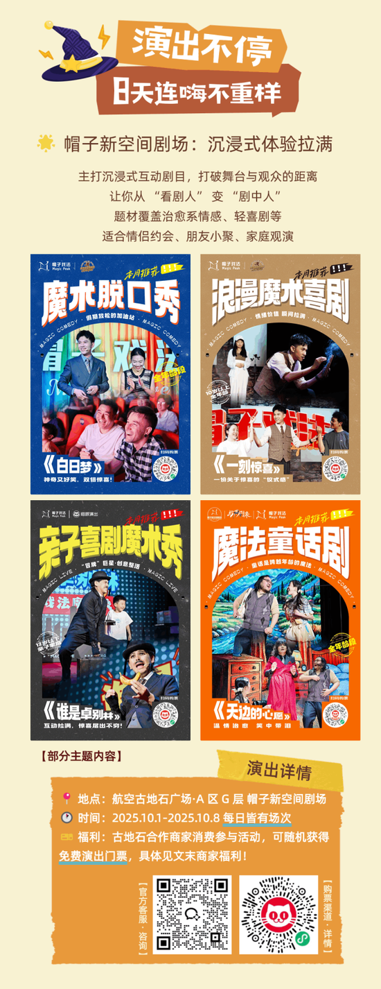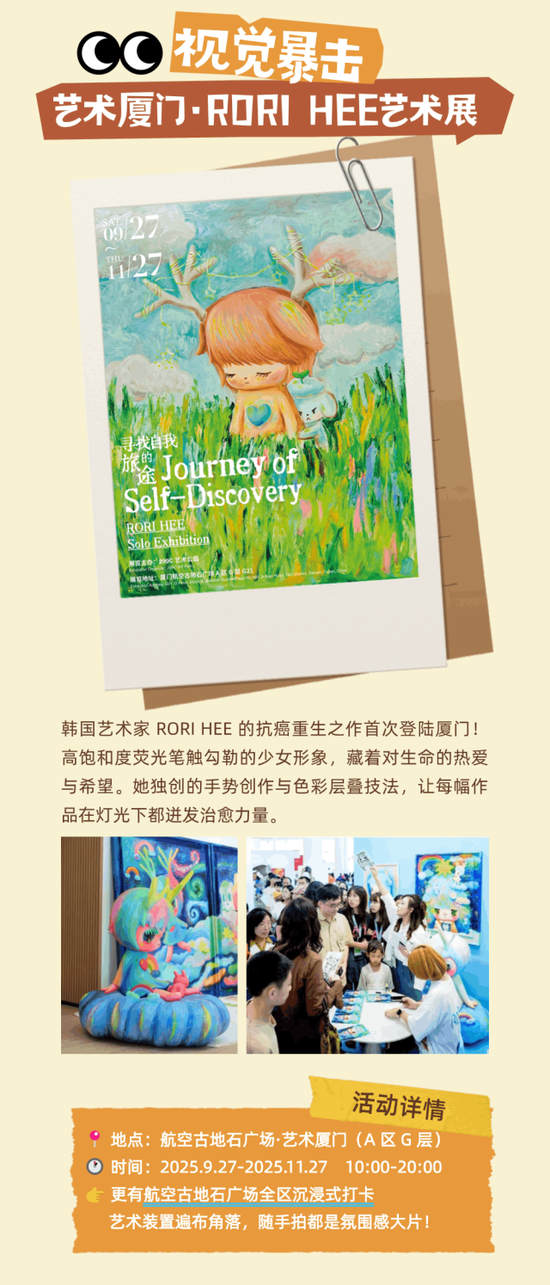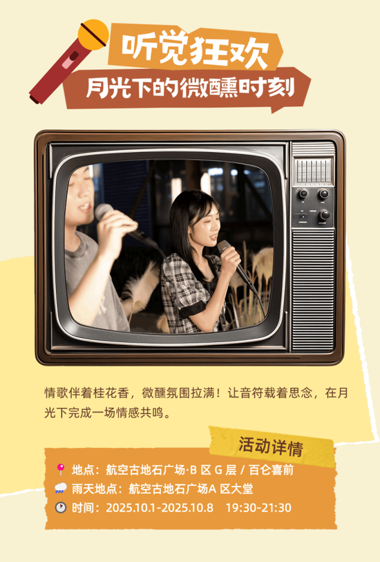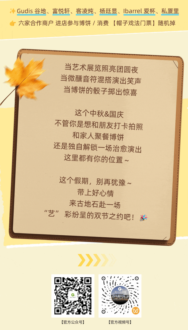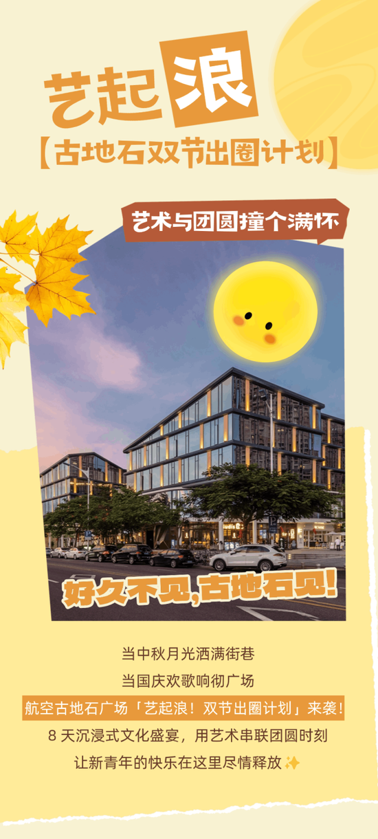 当中秋月光洒满街巷,当国庆欢歌响彻广场,航空古地石广场携‘艺起浪!双节出圈计划’来袭!‘RORI HEE 艺术展 + 全区快闪’、微醺音乐会、帽子新空间剧场、来疯脱口秀、博饼赢精酿+现金红包。。。。。。8天沉浸式文化盛宴,用艺术串联团圆时刻,让新青年的快乐在这里尽情释放。