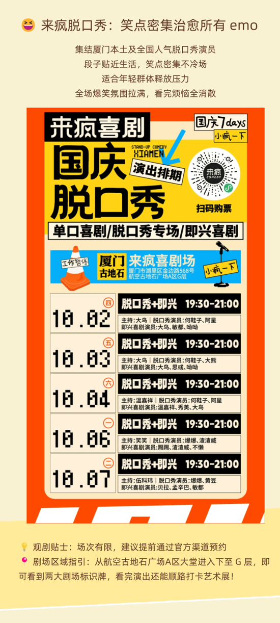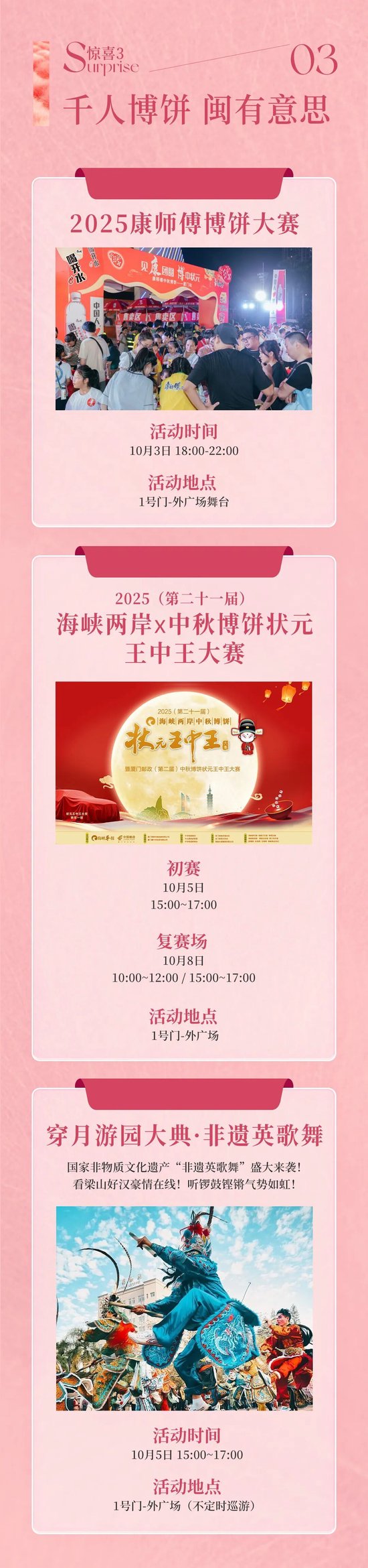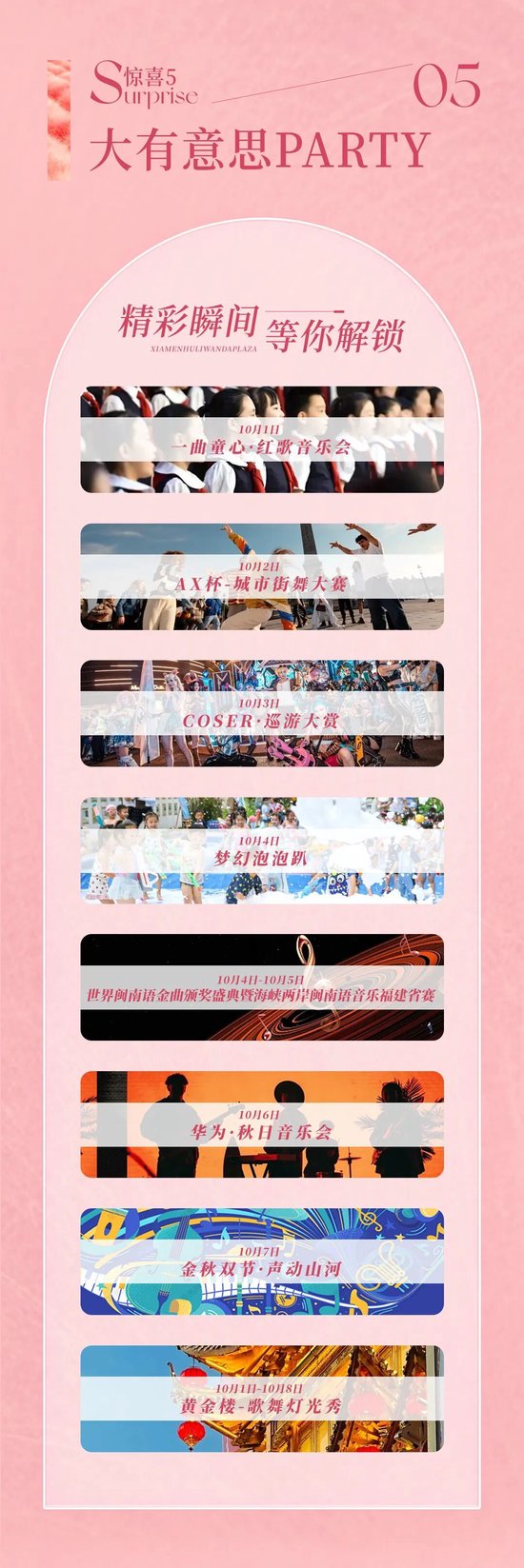 9月30日-10月8日,神秘大咖空降、群星歌迷演唱会加电音夜、千人博饼大会、非遗英歌舞表演、抢盲盒赢豪礼、 惊喜气球雨、抽茅台,还有美食和出行优惠等你来参与!