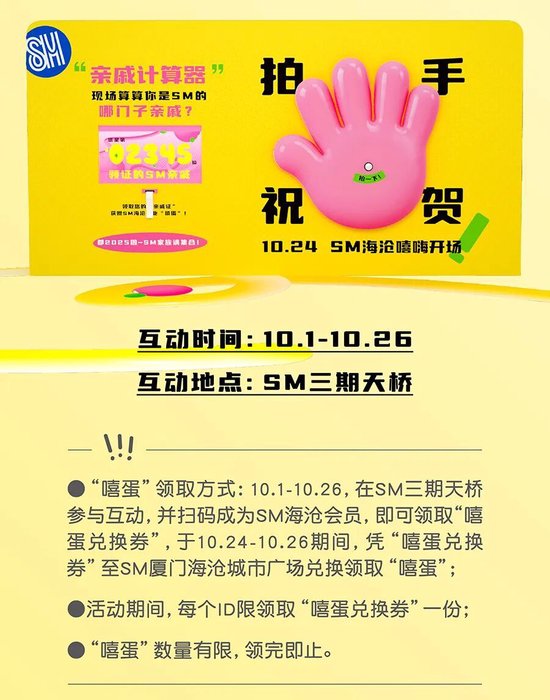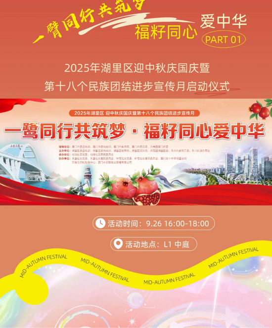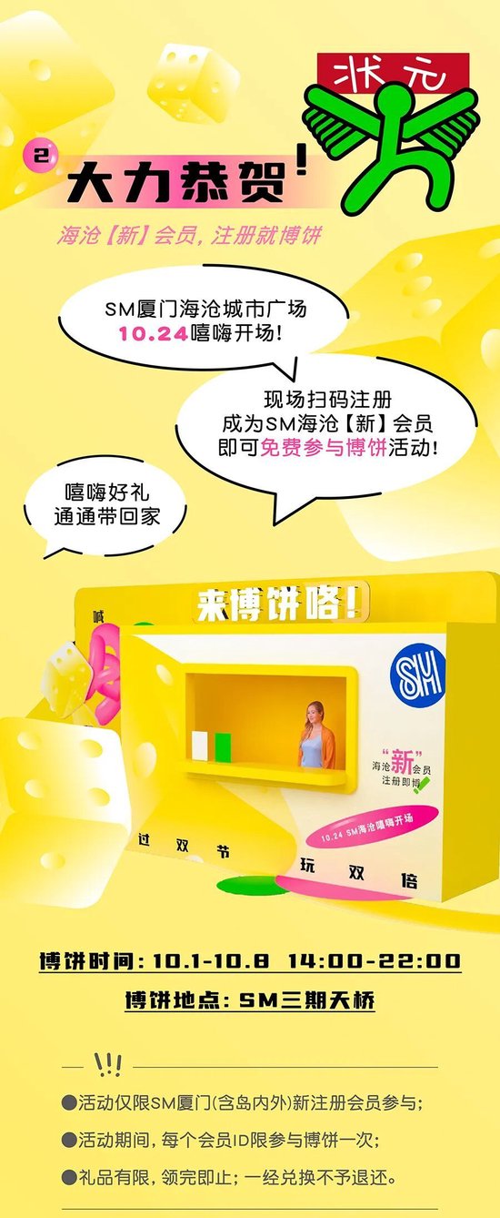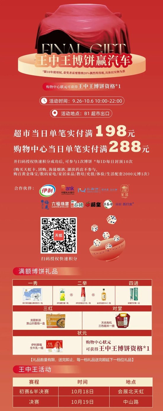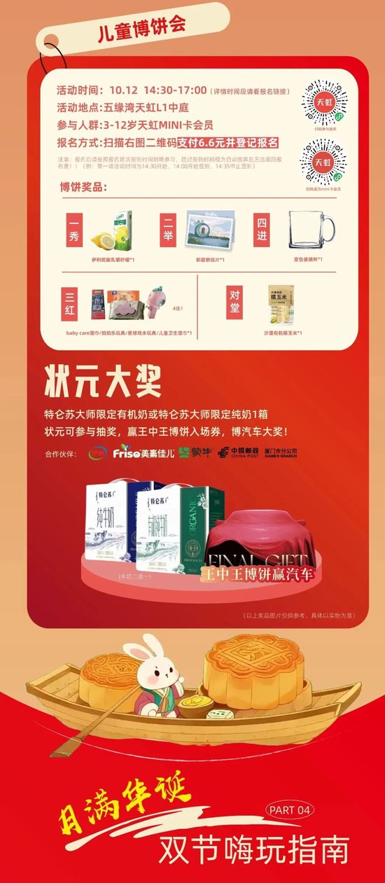 月满华诞,好事成“双”。即日起至10月6日,商场推出消费满额博饼活动,参与者有机会赢取王中王入场资格,角逐汽车大奖;期间还将举办多场特色活动,亲子绘画 DIY、“成功出发” 乐游湖里好运车互动体验、舒克肖战生日应援专场、10月7日至8日14:00-18:00,L1 中庭还将开展美赞臣专场路演及博饼活动。