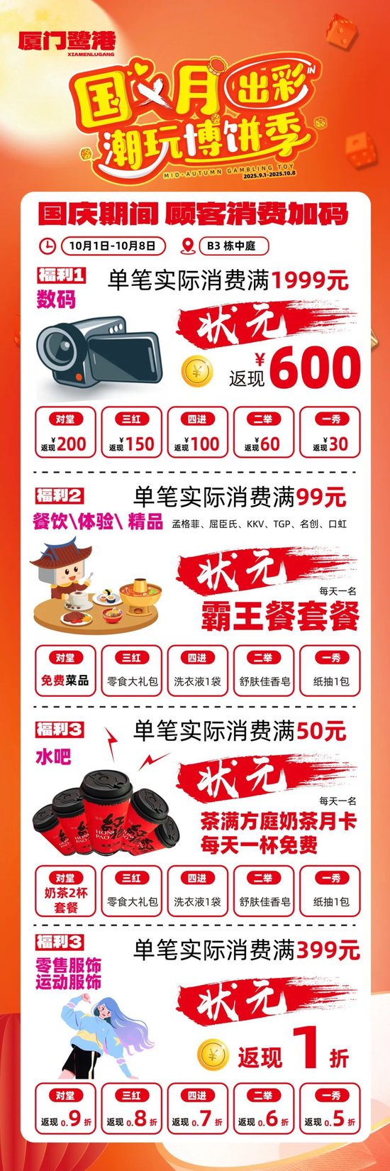 10月1日- 10月8日期间,厦门鹭港将举办 “国 X 月出彩潮玩博饼季” 活动。快来赢取数码消费返现,餐饮、体验、精品消费霸王餐、零售服饰、运动服饰满减。