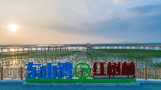 在漳州东山县东山湾,200多公顷红树林绿意葱茏,一条木栈道宛如飘带,舒展在海面之上。间或有几只白鹭翩然飞过,栖落在枝头、水畔。