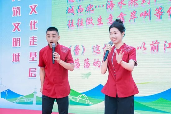 濠头蔓菁艺术团舞蹈《杜鹃红》展生活美好;文化队小品《文明湖里幸福之约》以邮轮趣事说文明创建;嘉福韵答嘴鼓《话说江头》用闽南语话江头变迁,掌声不断。
