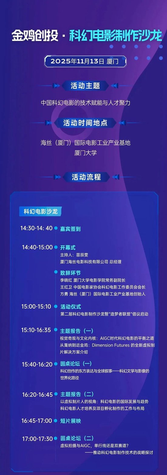 作为金鸡创投大会的重磅单元,本次活动将通过产业协同、人才聚力、内容创新与技术赋能的深度融合,为厦门影视产业注入科幻新动能,助力厦门成为中国科幻电影创作与科技应用的前沿阵地。