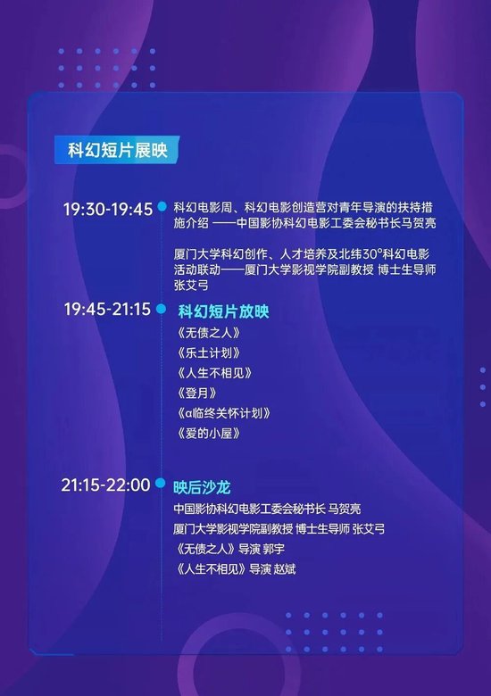 有思想的碰撞,更有作品的交流。作为此次沙龙的另一亮点,7部优质科幻短片也将在厦门大学集中亮相。现场,导演代表将与行业专家、学者展开深度交流,分享创作背后的故事。