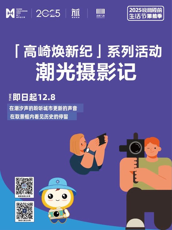 我们召集全市摄影爱好者、城市生活家,以不同视角解锁高崎新机位和打卡点,围绕高崎内人文、风光、历史点位进行拍摄(拍摄格式为jpeg格式),投稿参与 “潮光摄影记” 摄影比赛。专业评审老师将选出最具创意和表现力的作品,于12月8日在八角池举行作品展,让每一份光影作品都成为高崎焕新的见证。