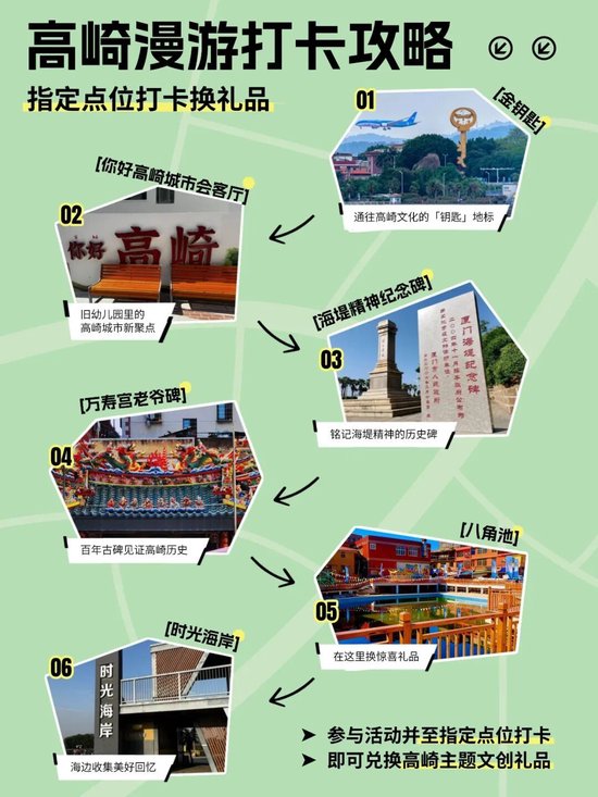 12月4日-12月8日,邀请居民朋友们来一场漫游之旅。前往高崎社的6个固定创意打卡点:金钥匙、你好高崎城市会客厅、海堤精神纪念碑、万寿宫老爷碑、八角池、时光海岸,参与趣味答题即可获得盖章,集满三个章,就能前往时光海岸兑换精美冰箱贴,把高崎的焕新记忆带回家