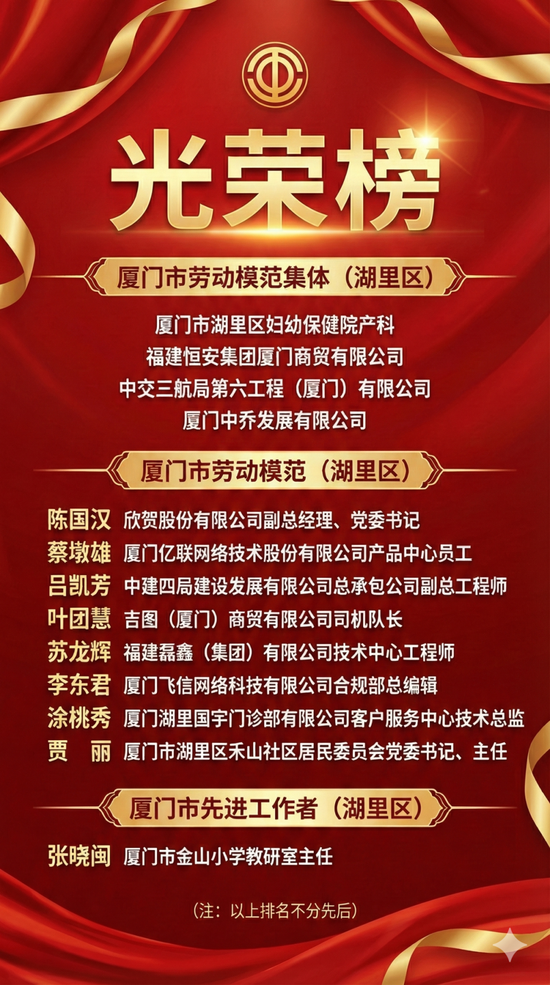 其中,湖里区4个单位荣获“厦门市劳动模范集体”,9名劳动者荣获“厦门市劳动模范”及“厦门市先进工作者”。
