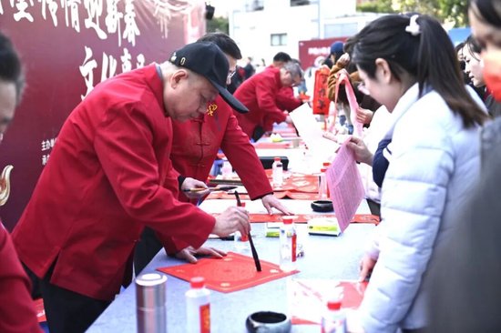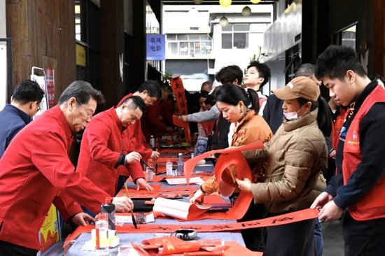 在金山街道金安社区的活动现场,十几位书法家铺开红纸、挥毫泼墨,笔锋游走间,春联跃然纸上。