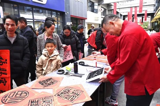 如果说春联是春节的“文化名片”,剪纸则是湖里区为传统技艺注入的“创新基因”。在剪纸体验区,湖里区非遗剪纸代表性传承人汤美霞手持剪刀,一张张红纸瞬间化作灵动的生肖图案。市民们争相体验,将剪纸作品带回家。