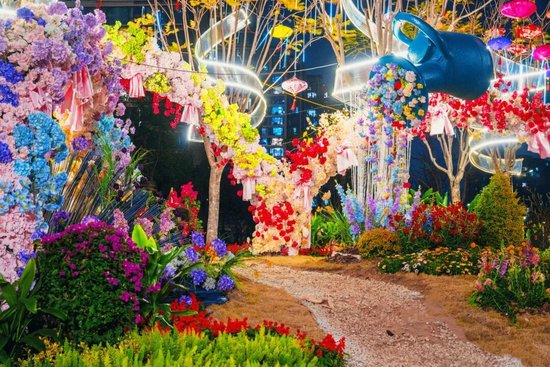 以三座精致花拱门为核心,嵌入寓意“福伴花来”的水壶小品,光影在花瓣与枝叶间跳跃,搭配复古灯笼与摇曳的飘带灯,十分梦幻。