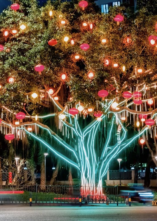 在东渡路旁,绚丽多彩的福字灯光挂满树梢,展现自然与光影的交织魅力。