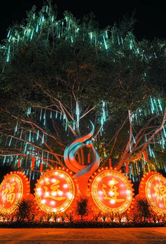 绚烂的“流星跑马灯”在大树间倾泻而下,与“福运连绵”四个大鼓造型花灯,将原本寂静的夜装点得绚丽夺目,如梦如幻。