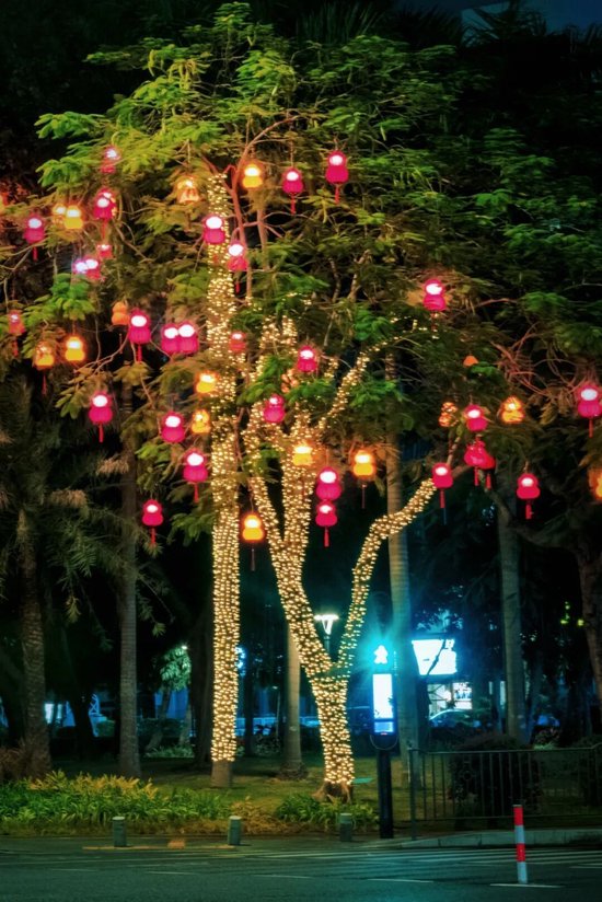转至金尚路与枋湖路交叉口,发现累累硕果悬挂枝头,引人注目。仔细一看,原来是柿子灯及如意灯,温暖而明亮。