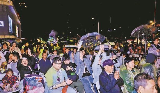 即便遇上雨天,群众依旧热情高涨。图为群众观看舞台表演。
