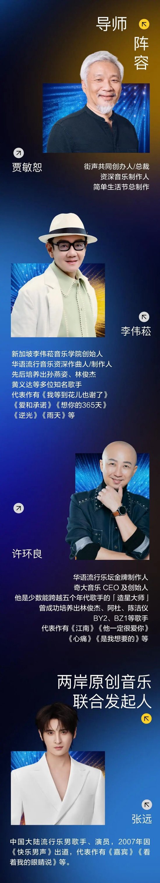 创作营邀请街声共同创办人、资深音乐制作人贾敏恕,华语流行音乐资深作曲人/制作人李伟菘,华语流行乐坛金牌制作人许环良作为导师,著名歌手张远作为两岸原创音乐联合发起人,以专业引路、以创作发声,全力护航音乐人才成长与作品孵化升级。