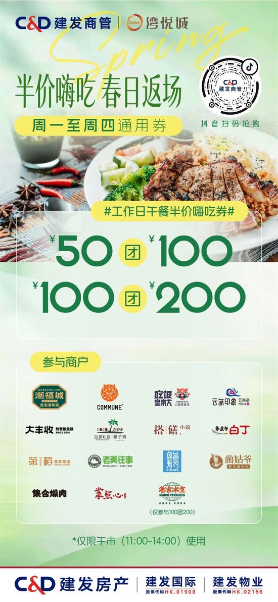 春日返场,半价悦食~湾悦城甄选餐饮午市礼遇来啦!50团100/100团200,甄选餐饮券!为工作日注入精致烟火气。