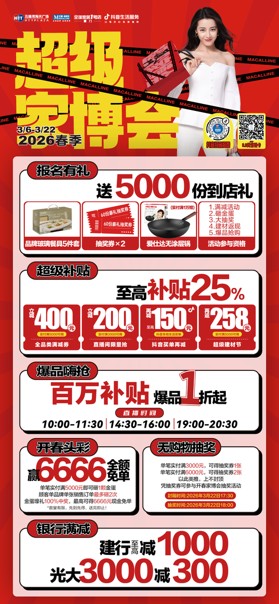 一站式家装采购,涵盖全品类家居建材!签到送礼,至高补贴25%,还有机会赢6666现金免单、抽百寸电视、洗碗机、冰箱等60件壕礼,爆款1折抢购……