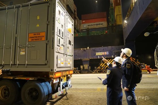 海事执法人员对即将海运出口的集装箱式锂电池储能系统做最后的安全检查。