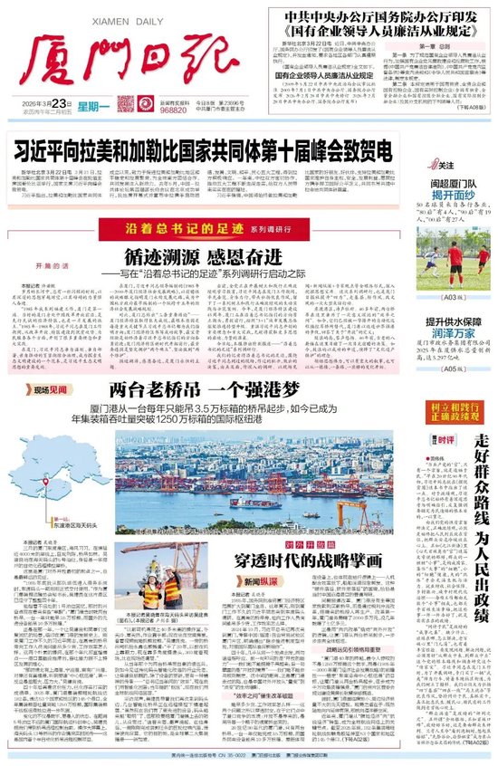 我们的记者将沿着总书记的足迹,围绕习近平同志到过的现场,作过的批示,做出的决策,由点及面,作深入的调研。以现场见闻+新闻纵深+专家观点等全媒体形式,深入挖掘思想宝库。这次系列调研行,也是厦门日报社提升“四力”,走基层、转作风、改文风的一次大型采访行动。