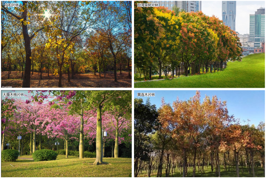 公园内以秋枫作为常绿基调树种,并配以凤凰木、台湾栾树、大腹木棉、黄连木、无忧花以及乌桕等红、黄色系植物。红黄色和绿色的背景形成强烈对比,鲜艳的色彩令人心情愉悦。