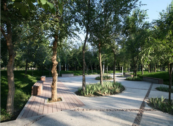 静谧林荫区:因边界密林区现状植被长势较好,故设计方式以保留为主,部分区域点植色叶树种,与公园形成整体景观。