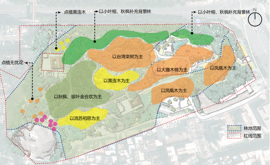 边界密林区:将保留现状长势较好的大乔木,布置如黄连木等色叶树种,打开观景空间视野范围,营造舒适宜人开阔的山顶景观。