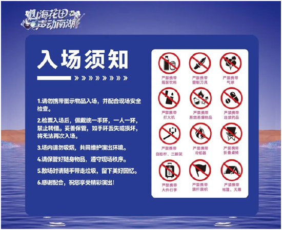 现场须知:场内请勿吸烟,共同维护演出环境;请保管好随身物品,遵守现场秩序,散场时请随手带走垃圾,留下美好回忆。