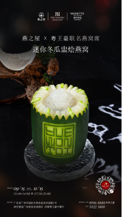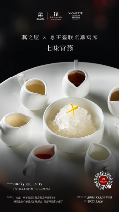 燕窝,这一凝结天地精华的珍品,在时光长河中始终闪耀着温润光泽。燕之屋用心打造每一份燕窝,从原料甄选至成品呈现,皆倾注非凡匠心。粤菜作为中国四大菜系之一,同样是非常具有代表性和世界影响力的中国饮食文化之一,与燕窝相得益彰。燕之屋与粤王臺联名燕窝席,以燕之屋印尼钻石产区①燕窝入馔,在粤王臺中餐行政总厨李志雄先生的妙手之下,实现了从传统滋补品到粤馔创意核心的华丽转身。七款珍馐菜品,仿佛一个个独具匠心的故事,串联起岭南风物与燕窝滋养的和谐共鸣。