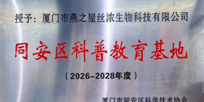 现在,这些问题的答案,您都可以亲眼见证。近日,经严格评审,我司被授予成为“同安区科普教育基地”。这一资质的获得,不仅是对燕之屋长期致力于燕窝科研创新与知识普及工作的权威认可,更标志着企业从“产品制造者”到兼具“科技传播职能”的升级,积极推动燕窝行业的高质量发展与中式滋补文化的广泛传播。同时,这还是一份面向所有消费者的公开邀请函——邀请您走进燕之屋,从源头到成品,亲身感受、亲眼验证一碗高品质燕窝背后的科技与匠心。