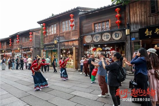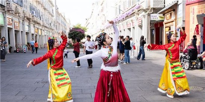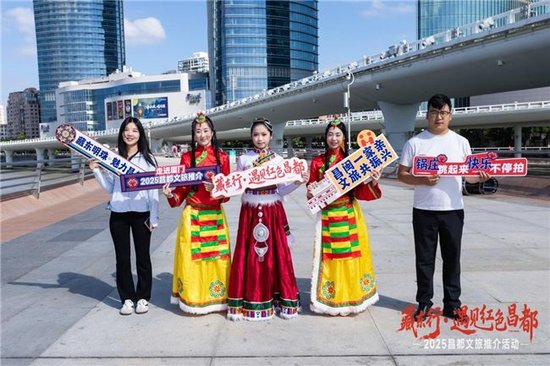 在厦门,昌都文旅快闪活动依次在世茂双子塔、中山路步行街与圆月广场等人气地标精彩上演。演职人员身着色彩绚丽的民族盛装,以豪迈奔放的舞步与悠扬深情的藏东民歌,将高原的豪情红韵巧妙融入滨海城市的现代节奏之中。