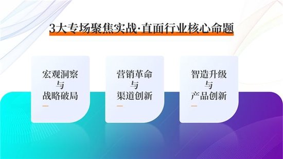 本次大会紧扣时代脉搏,在政策与市场双轮驱动下,大会设置 「宏观洞察与战略破局」「营销革命与渠道创新」「智造升级与产品创新」 3大核心专场,直击成本控制、渠道转型、技术迭代等痛点: