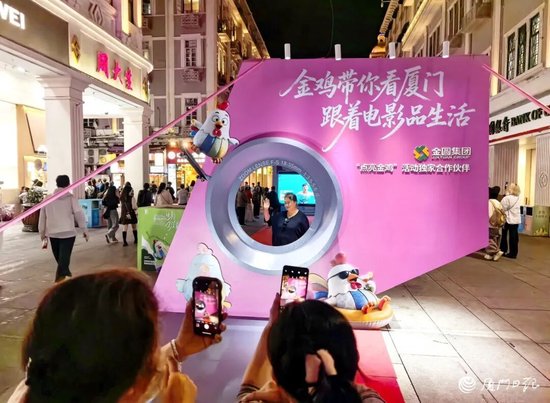 中山路金鸡打卡点结合电影元素与城市景观,吸引大量游客驻足拍照。(本报记者 王火炎 摄)