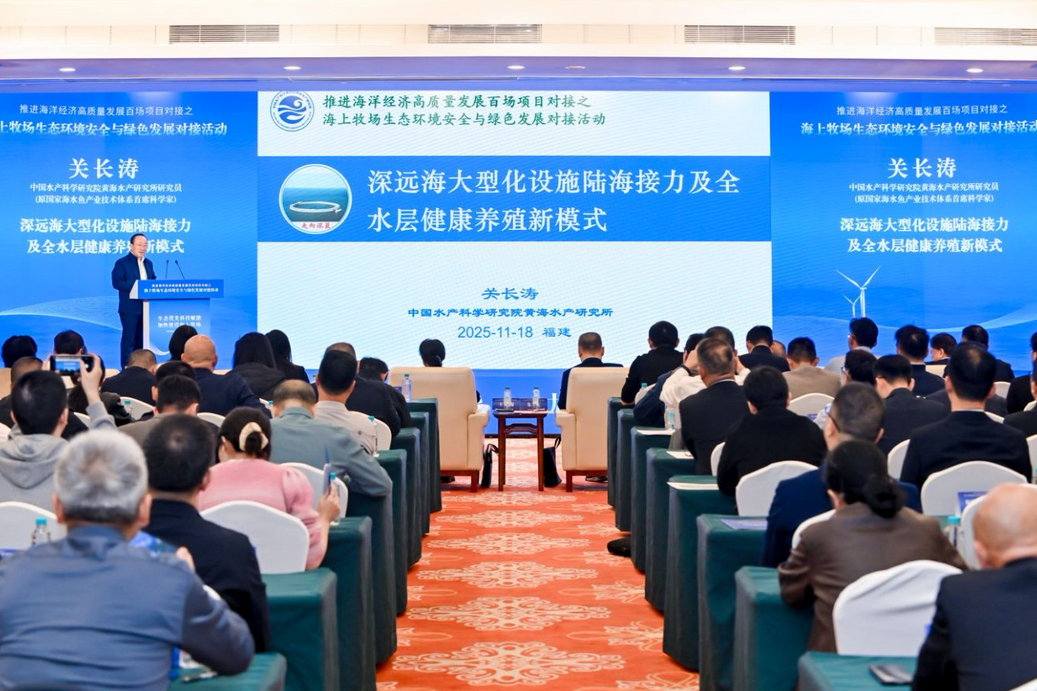 11月18日上午,推进海洋经济高质量发展百场项目对接之海上牧场生态环境安全与绿色发展对接活动在福州举行。活动以“生态优先科技赋能 加快建设海上牧场”为主题,由福建省海洋与渔业局和中国水产科学研究院联合主办,福建省海洋与渔业局二级巡视员朱红、中国水产科学研究院副院长王玉梅出席活动并致辞。