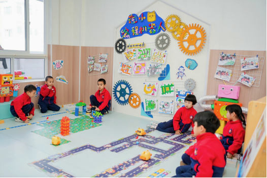 科学探究室里,淘小鹰编程机器人相关活动气氛热烈。孩子们分组围绕《小镇故事》《寻宝大冒险》主题,动手搭建地图、设计指令、操控机器人冲向终点。这种实物化、游戏化的编程形式,既锻炼了幼儿逻辑思维与团队协作能力,也让抽象计算思维在趣味对抗中自然萌芽。