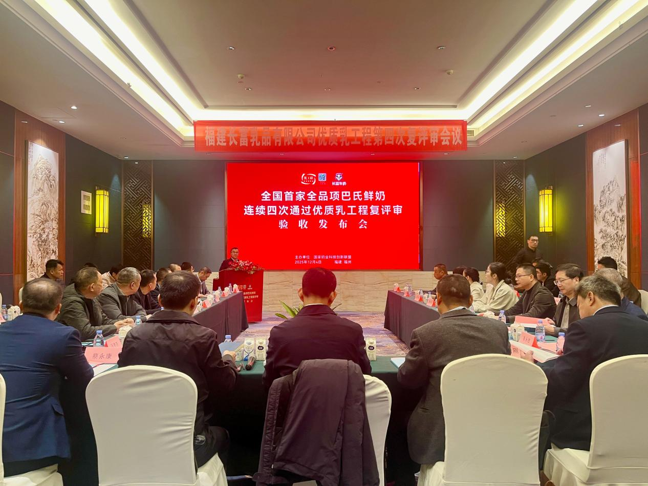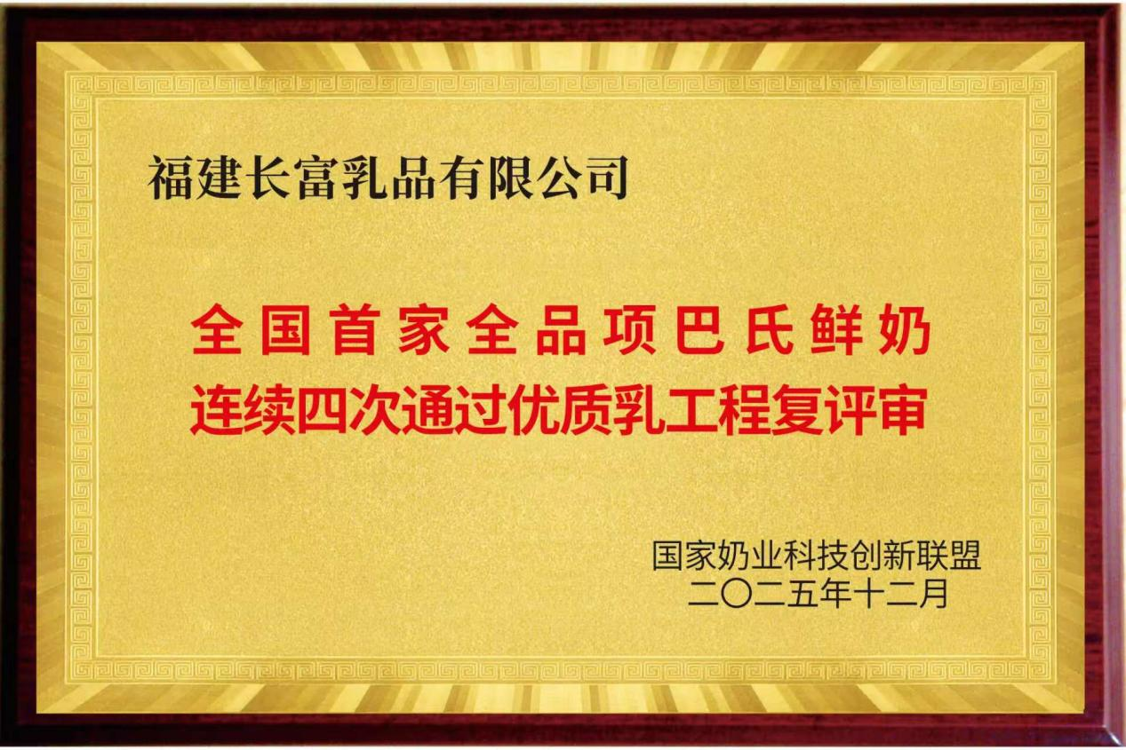 关注连续四次,全部通关!12月4日,国家奶业科技创新联盟在福州发布最新复评审结果:福建长富乳品有限公司成为全国首家且唯一实现“全品项巴氏鲜奶连续四次通过优质乳工程复评审”的乳企——经专家组严格评审,其全品项巴氏鲜奶均符合优质乳标准,顺利通过第四次复评审。这项被业内称为“最严苛”的考核,不仅标志着长富全产业链品质体系通过了稳定性与持续性的终极检验,为我国奶业在“优质奶、本土奶”战略方向上提供了一份坚实的“鲜”行示范,更向市场有力宣告:依托本土生态资源,中国完全能够稳定产出世界级品质的优质鲜奶。