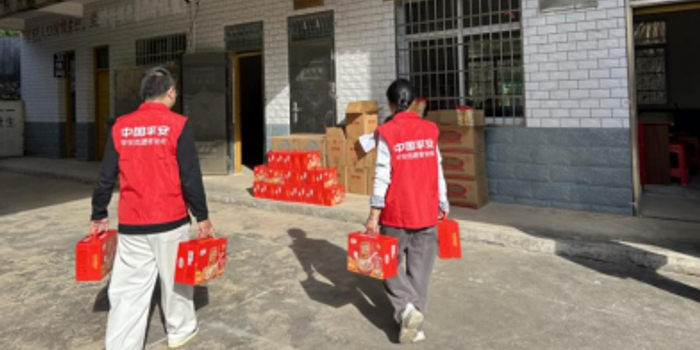 一大早,平安志愿者们就忙活起来,把物资一袋袋分装好,每一份都沉甸甸的,装的不只是米面油,更是一份实实在在的心意。到了村里,平安志愿者们兵分两路:行动不便的老人,平安志愿者们上门送物资,还顺道给老人量量血压、聊聊天;其他老人则在村部统一领取,现场热热闹闹,笑声不断。