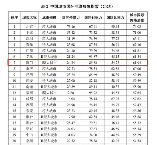 厦门多项第一!《中国城市国际网络形象指数报告(2025)》发布
