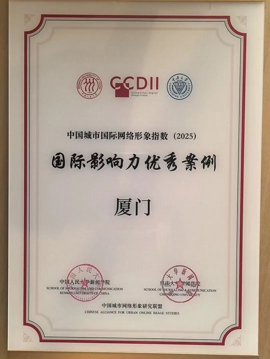 厦门在国际网络形象指数跻身全国城市国际网络形象第一方阵,位列全国第七,在同类I型大城市中综合排名第一。其中,国际认同力指数在同类I型大城市排名第一,国际传播力、国际影响力指数均排名第二。厦门入选中国城市国际网络形象指数报告(2025)国际影响力优秀案例。
