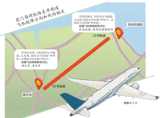 如果市民和游客想看到“飞机从头上降落”,在应用程序上查询完使用跑道号后,可以根据使用的跑道号,到不同的地点拍摄落地飞机——如果飞机使用05号跑道可以去清水宫拍摄,使用23号跑道时则可以去环岛北路附近拍摄。