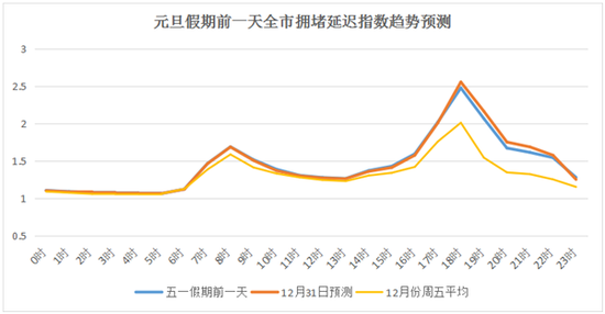 假期前一天(12月31日)为最后一个工作日,预测16时开始,全市各主要通行干道、城市快速路和进出岛“五桥两隧”拥堵指数开始逐步上升,到18时10分许全市拥堵指数达到峰值,出现较为明显的车辆缓行情况,并将会持续到21时30分许。车流主要集中在城市主干道、城市快速路、“五桥两隧”的出岛方向以及连接“五桥两隧”的各主要道路,以东西走向的翔安隧道出岛方向、海沧大桥出岛方向缓行情况较为突出。
